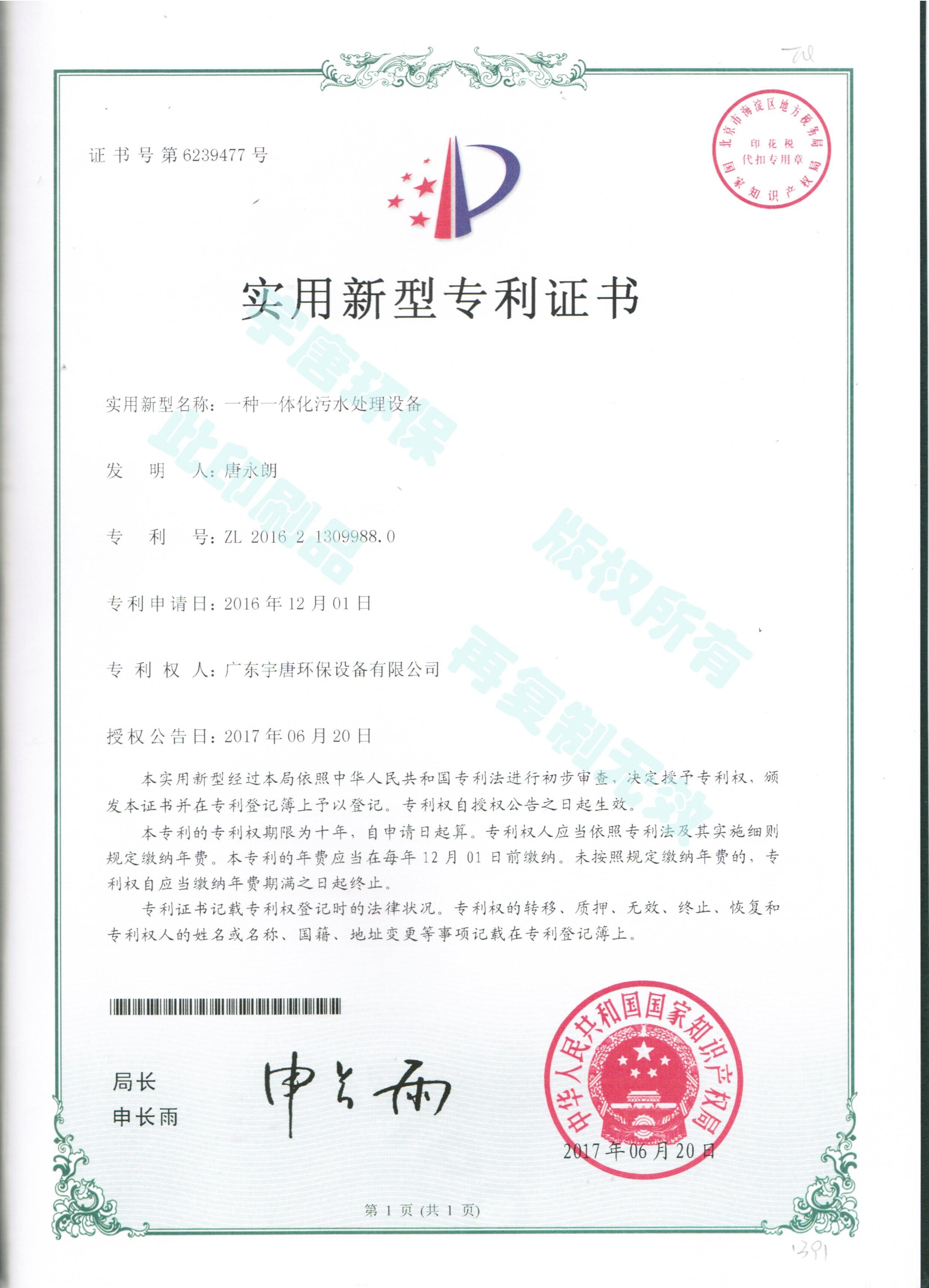 一种一体化污水处理设备实用新型专利证书