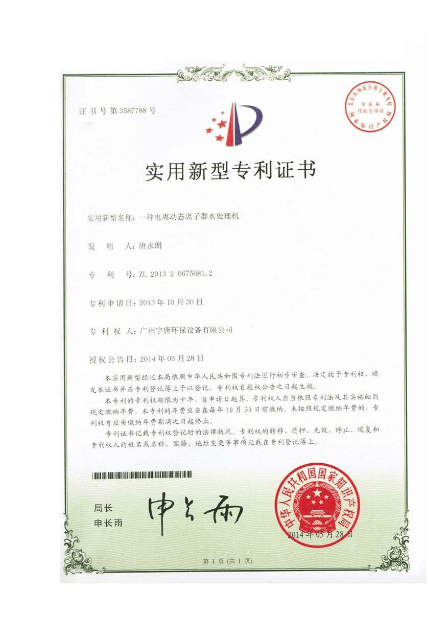 一种电离动态离子群水处理机组实用新型专利证书