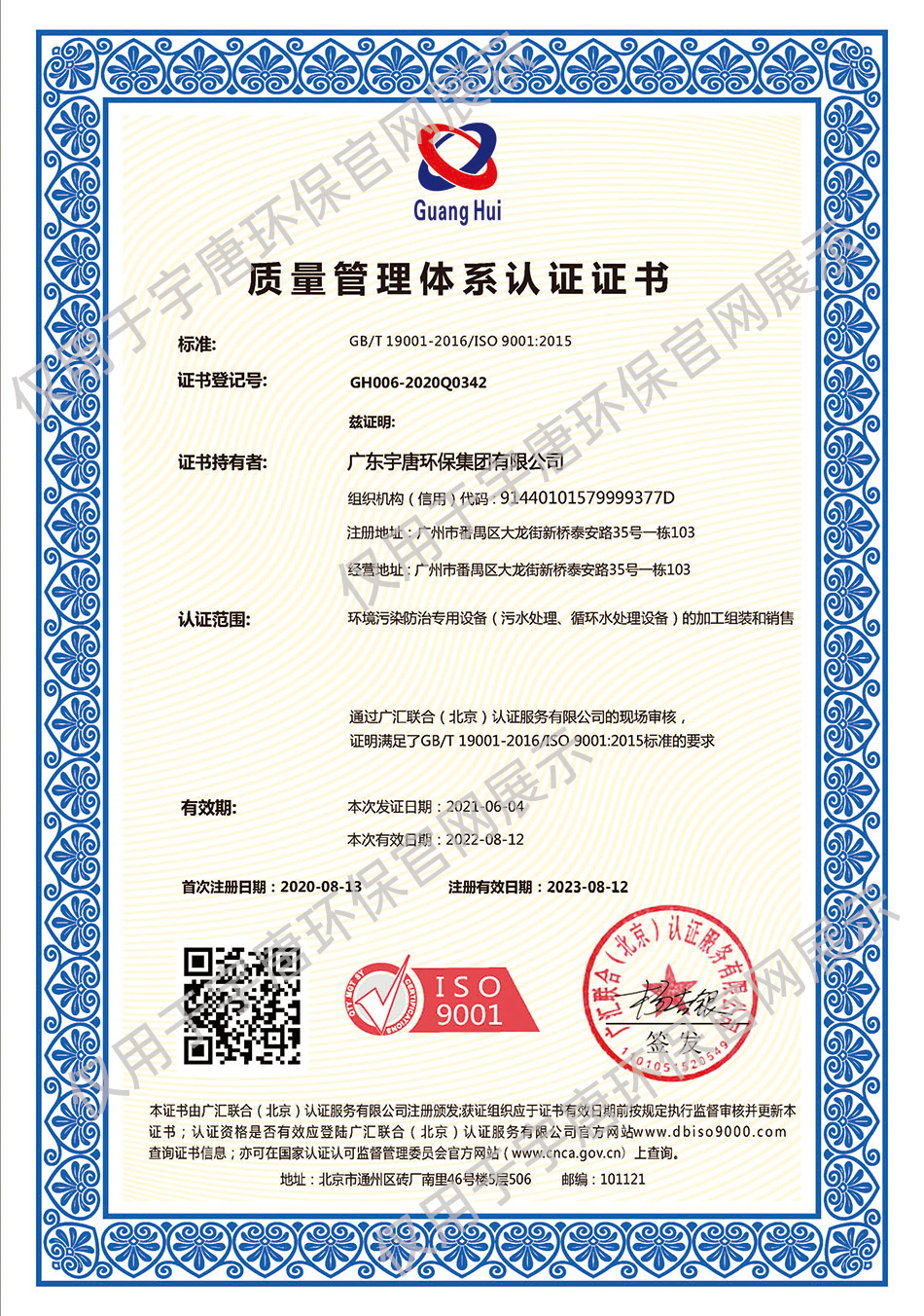 质量管理体系认证证书ISO9001